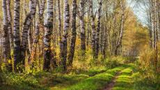 Обои Дорога в березовой роще осенью