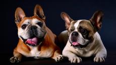 Обои Два золотистых ретривера сидят на фоне синей стены