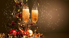 Обои Два фужера с шампанский с новогодним декором под елкой