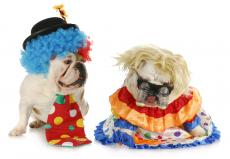 Обои Два английских бульдога в маскарадных костюмах на белом фоне