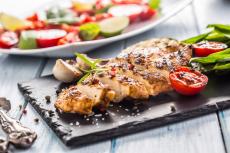 Обои Мясо с рыбой на столе с овощами и фруктами