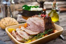 Обои Аппетитное запеченное мясо на столе с чесноком и картофелем