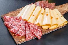 Обои Колбаса, мясо и сыр нарезанный на разделочной доске