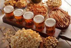 Обои Пиво с орешками, фисташками, попкорном и печеньем на столе