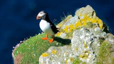 Обои Птица тупик сидит у воды на траве