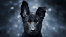 Обои Черный бульдог на сиреневом фоне крупным планом