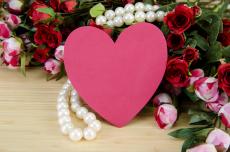 Обои Розовое сердце, букет роз и бусы из жемчуга для любимой на день влюбленных