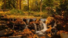 Обои Быстрая вода водопада стекает по камням в осеннем лесу
