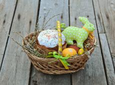Обои Пасхальный кулич в корзинке с игрушками на столе
