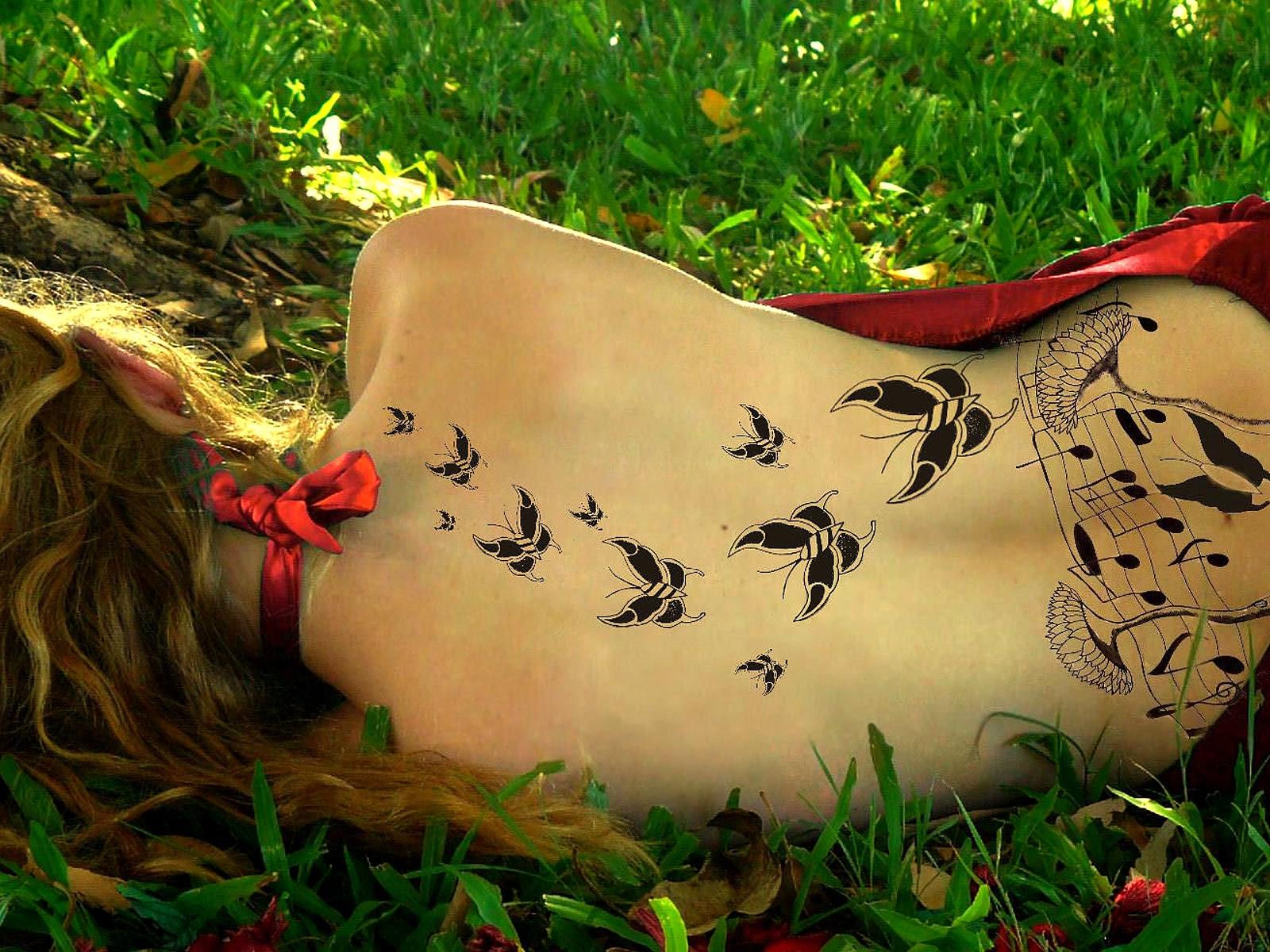 Обои Бабочки тату на спине у девушки