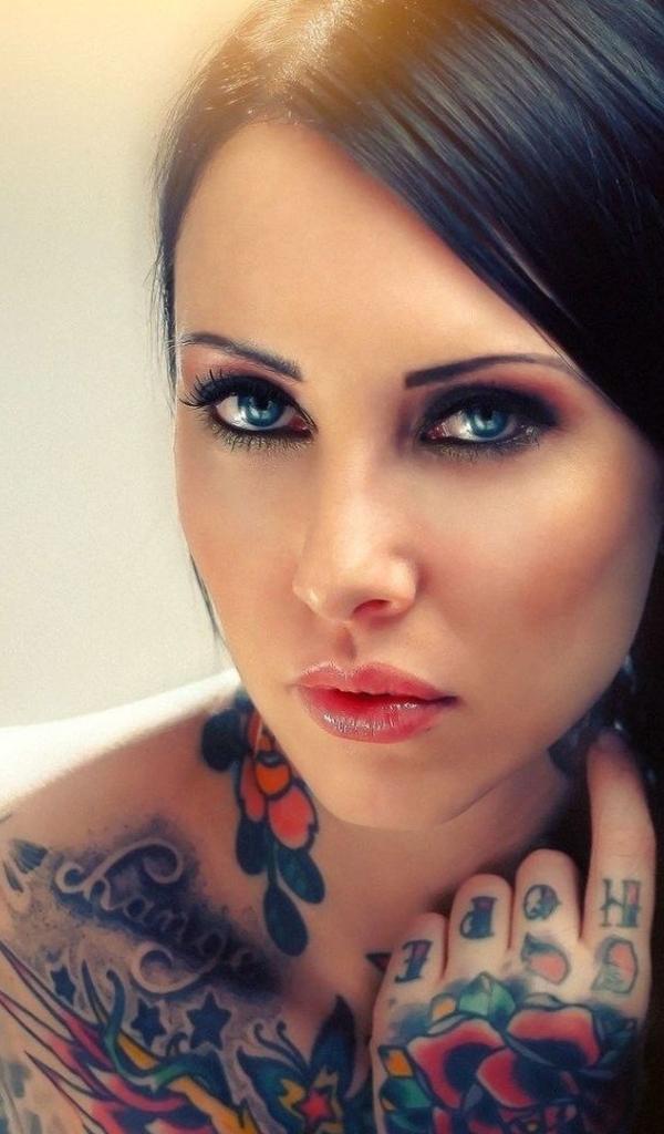 Обои Голубоглазая девушка с татуировкой на руке и плече