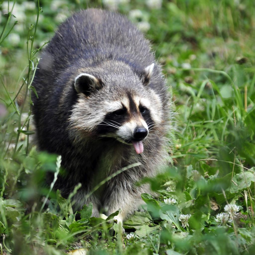 Обои Енот-полоскун идет по зеленой траве