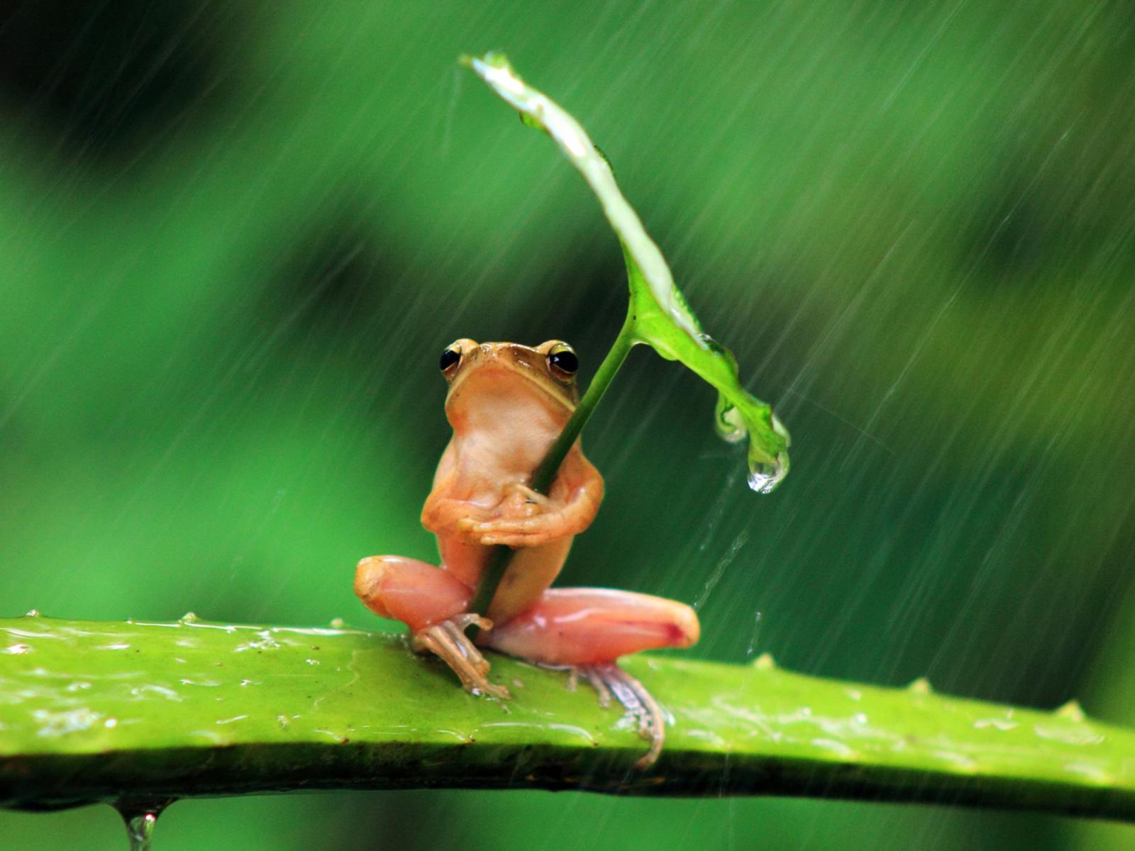 Обои Розовая лягушка прикрылась листом от дождя