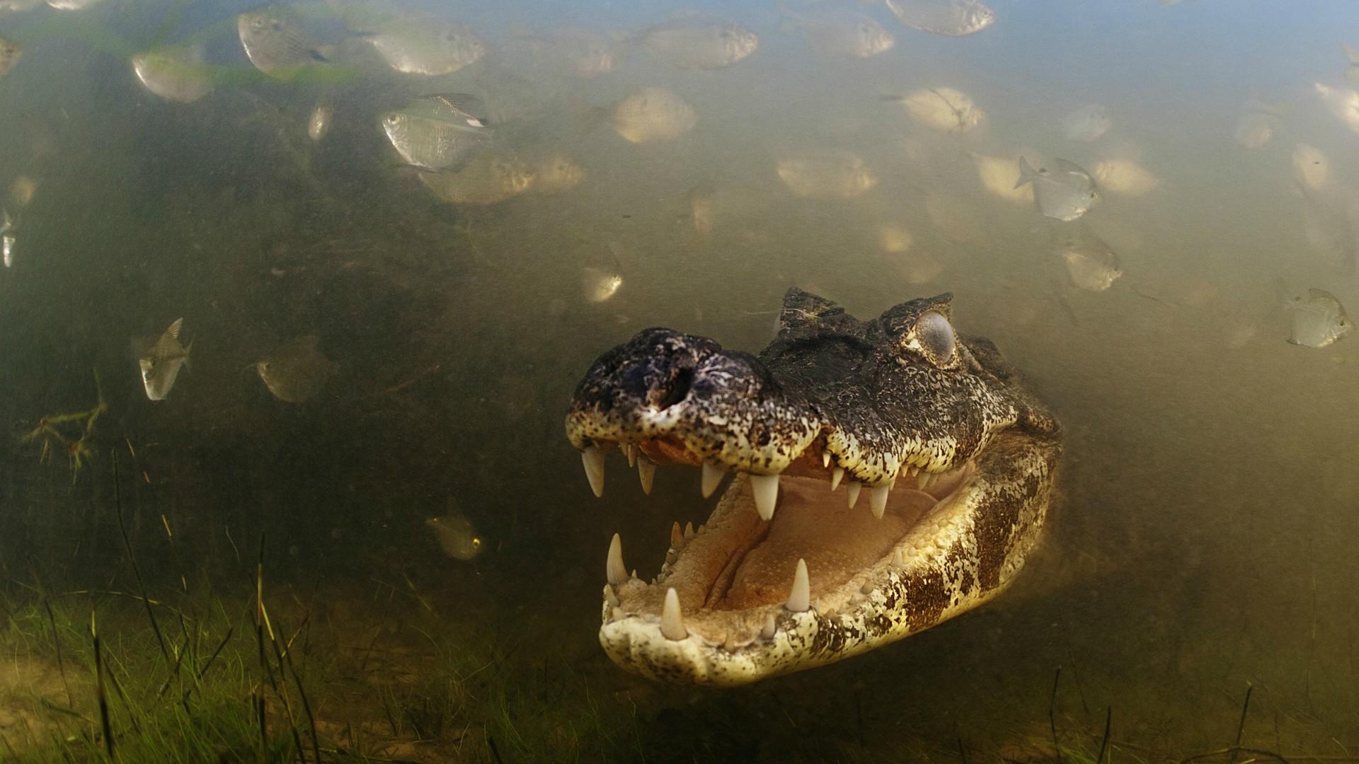 Обои Злобный крокодил среди рыб
