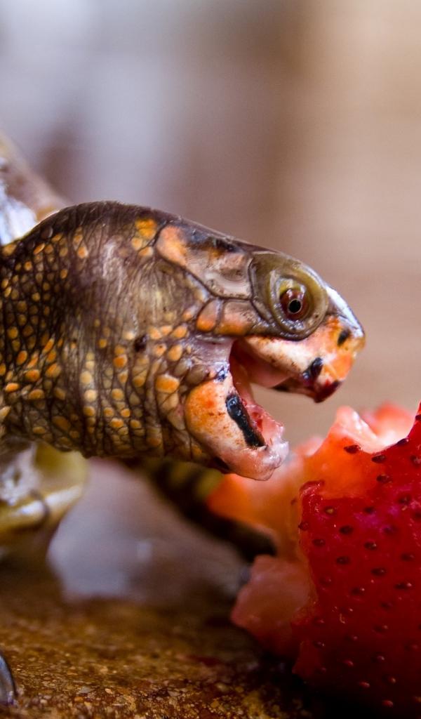 Обои Черепаха с удовольствием ест клубнику