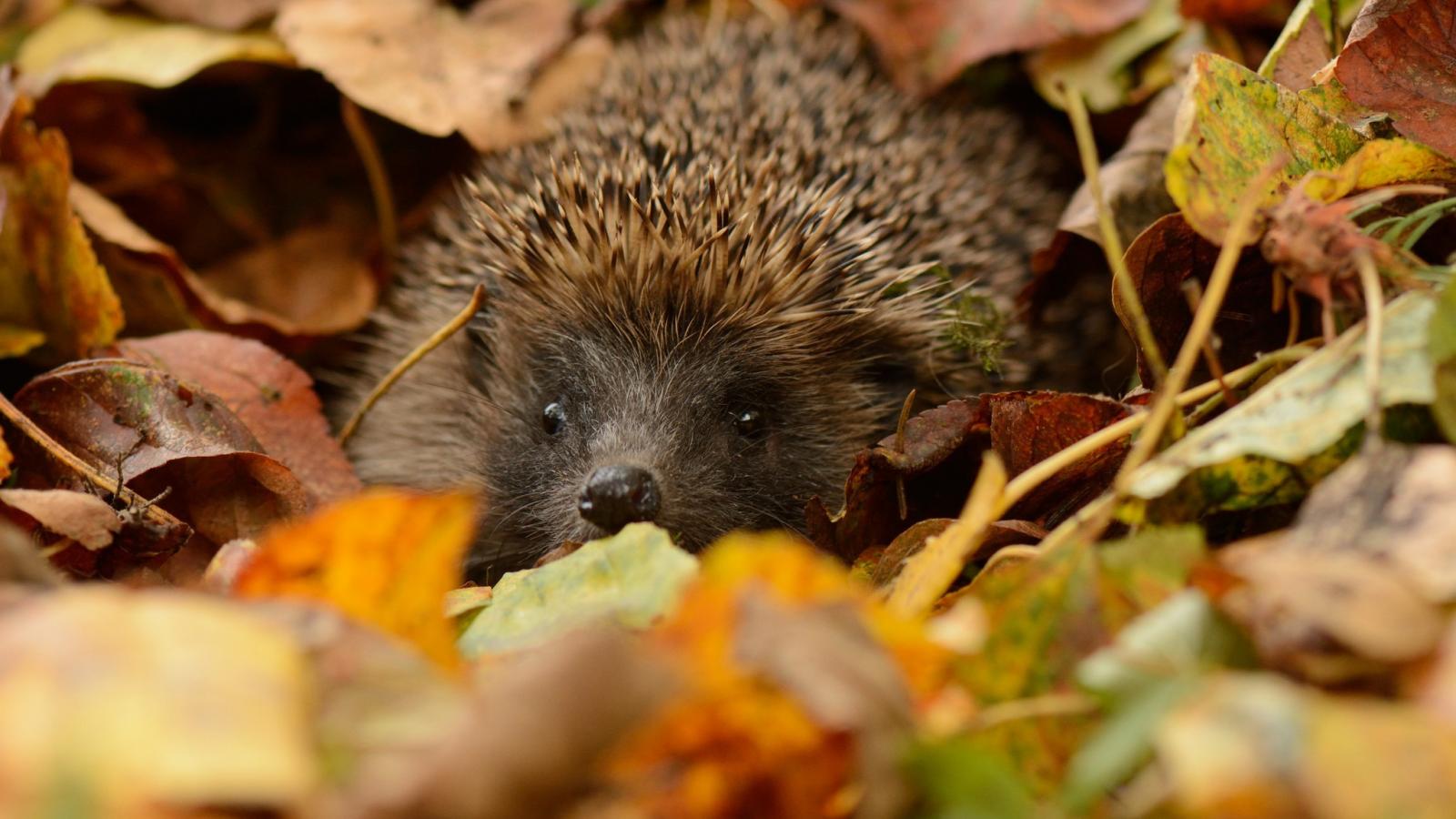 Обои Еж прячется в листьях