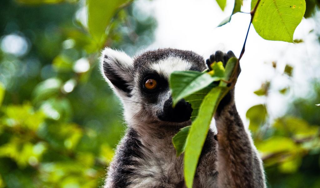 Обои Лемур прячется за листиком