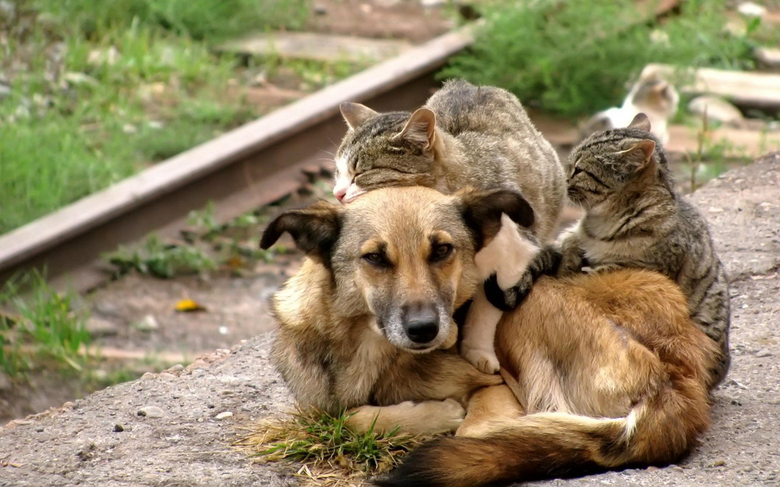 Обои Коты обнимают собаку