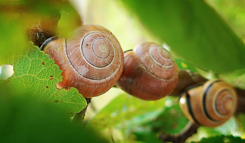 Обои Три улитки на листьях