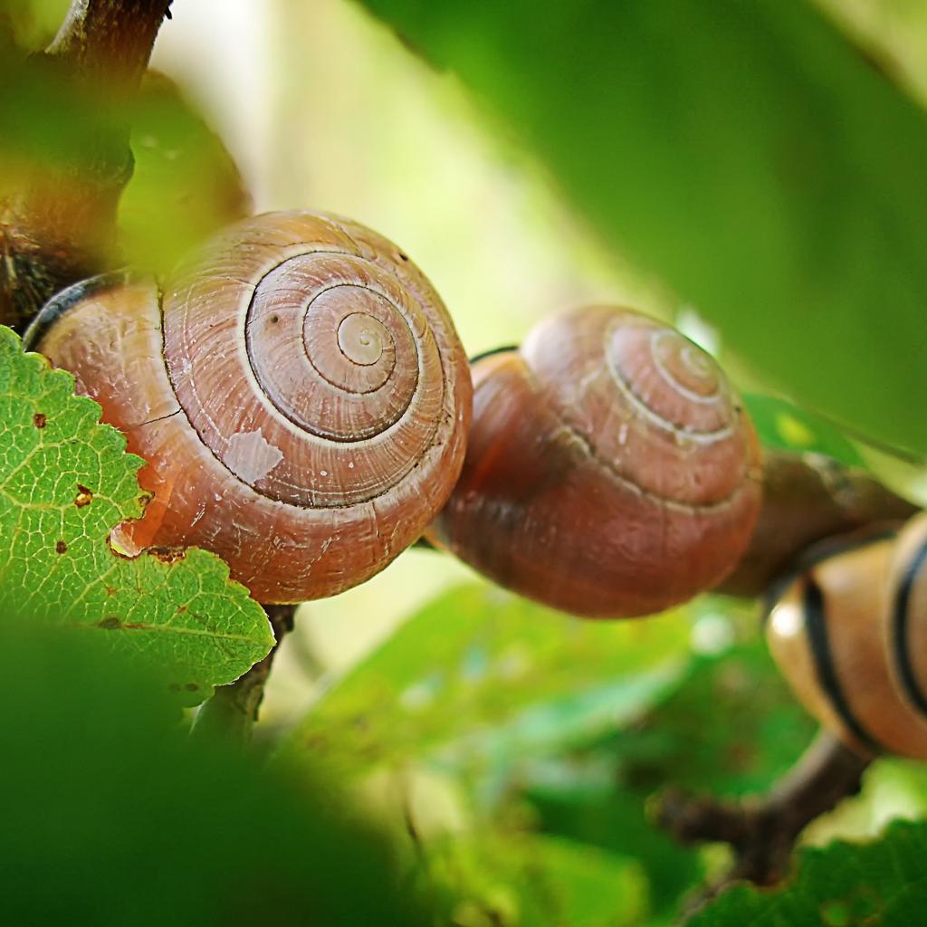 Обои Три улитки на листьях