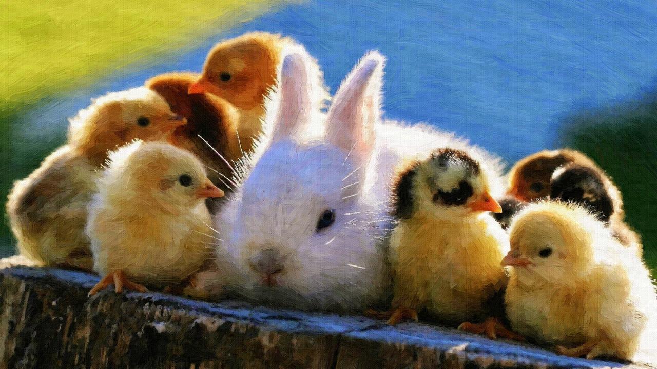 Обои Кролик среди желтых цыплят