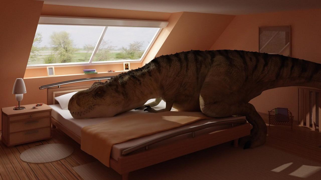 Обои Динозавр прилег на кровать