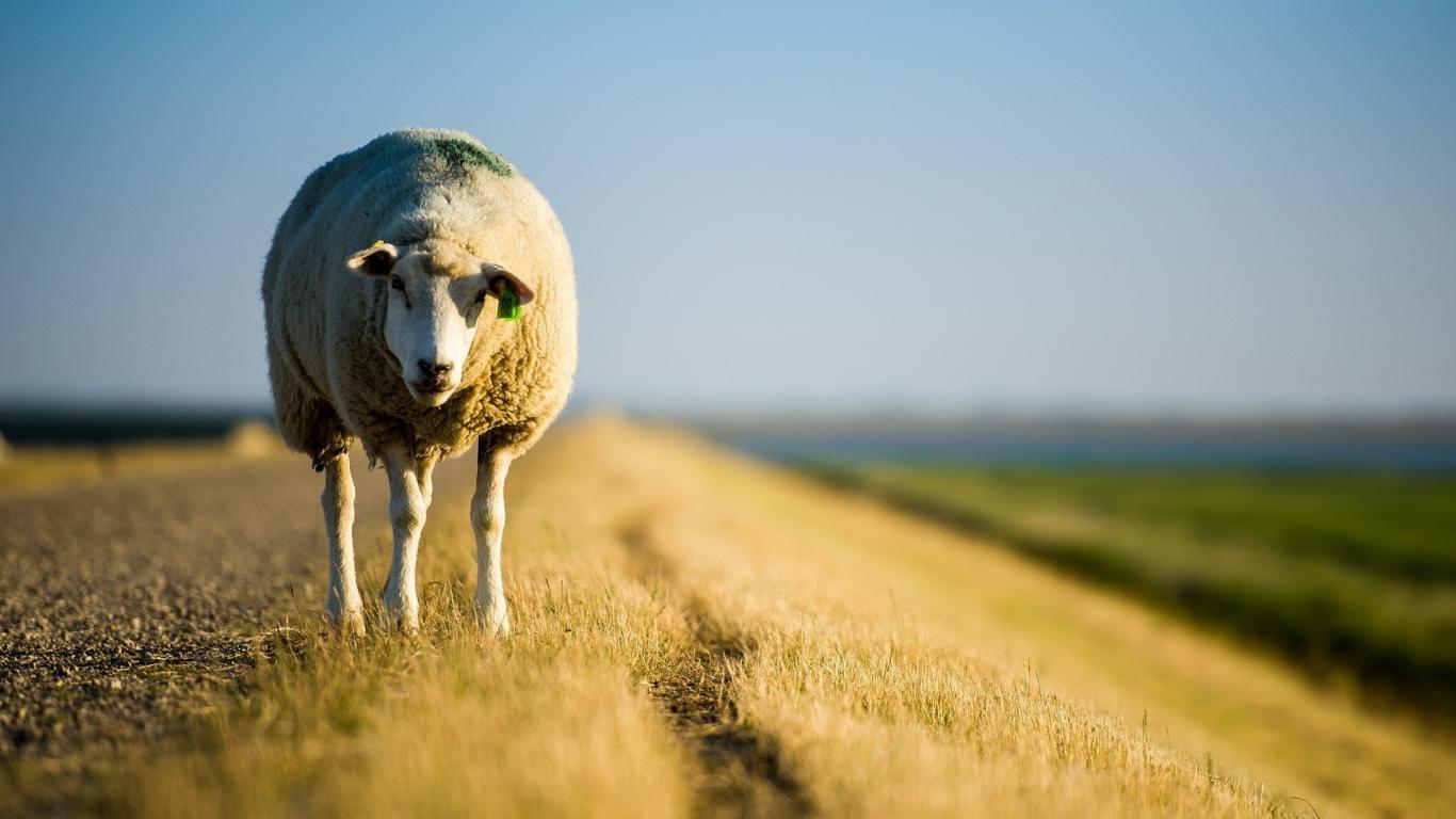 Обои Овечка стоит на обочине дороги