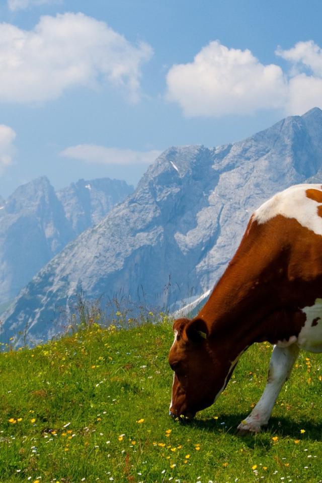Обои Корова на альпийском поле