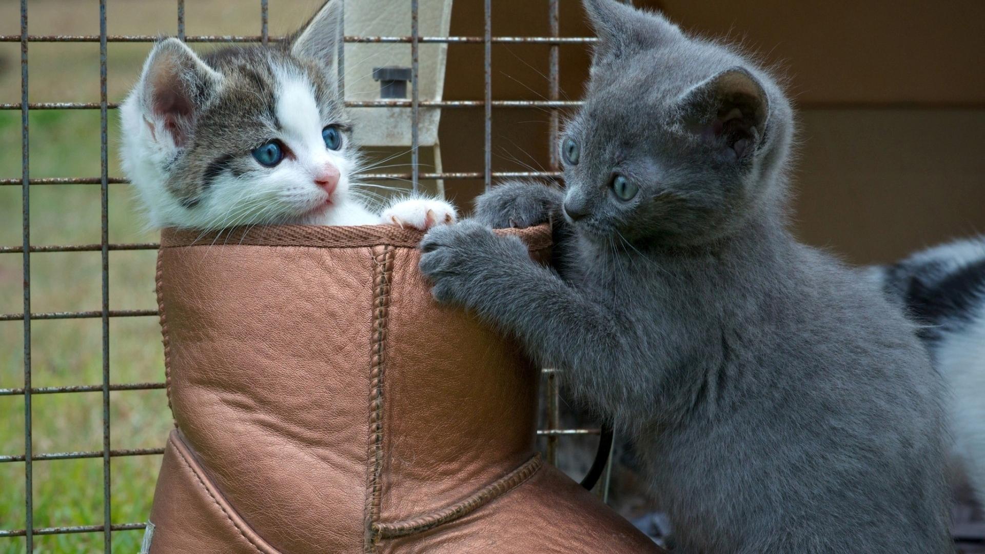 Обои Два котенка играют в ботинке