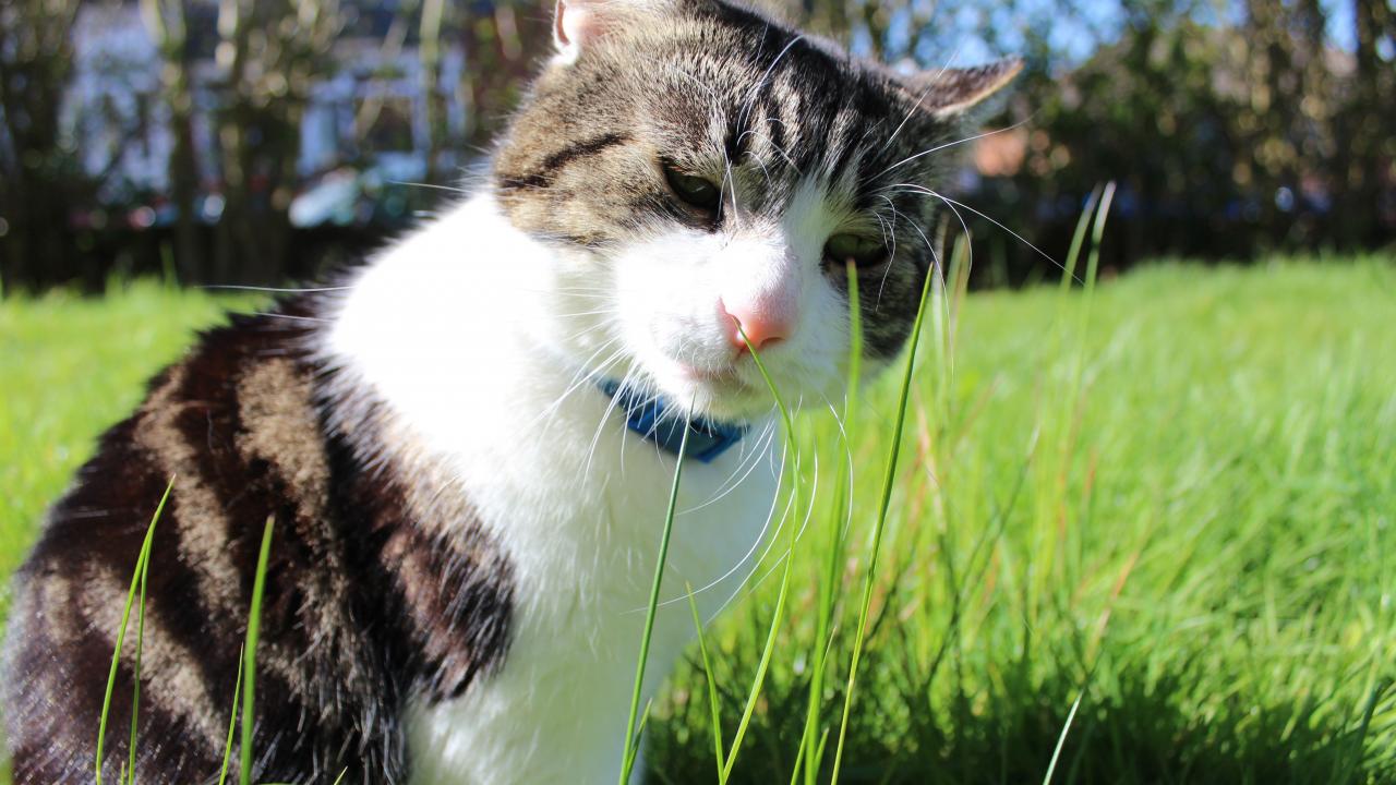 Обои Грустный домашний кот на траве