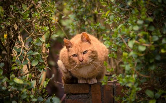 Обои Рыжий кот на каменном заборе