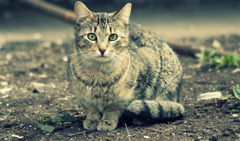 Обои Зеленоглазый домашний кот сидит на земле