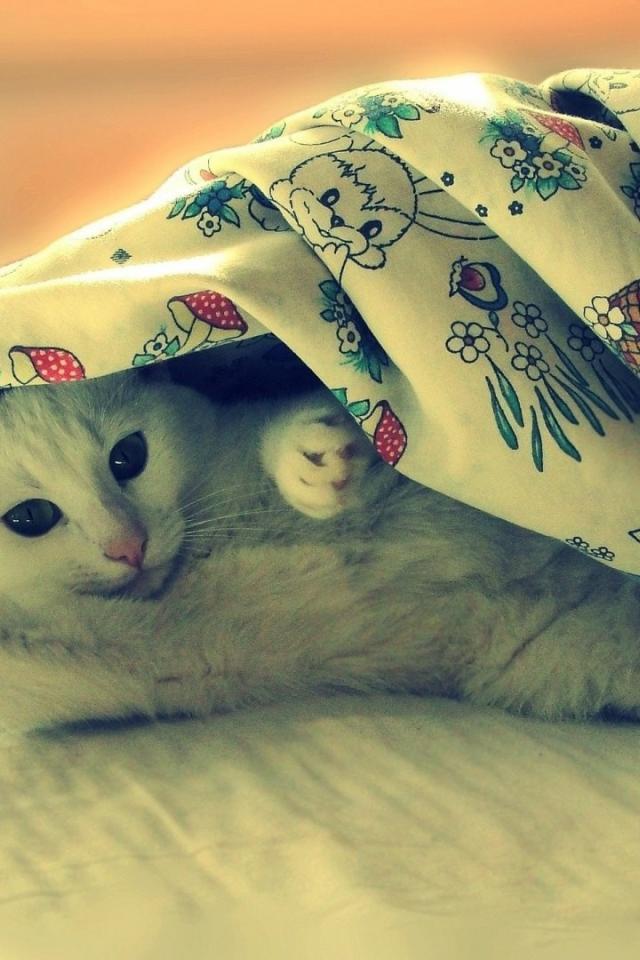 Обои Белая кошка потягивается под одеялом