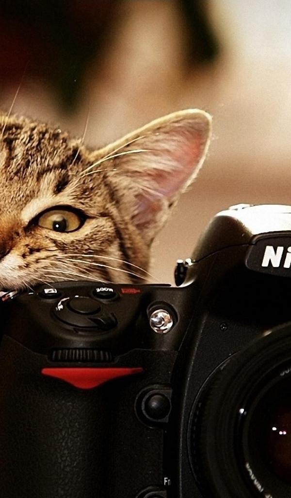 Обои Кот грызет фотоаппарат Никон