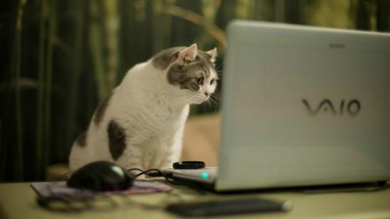 Обои Кот смотрит на экран ноутбука