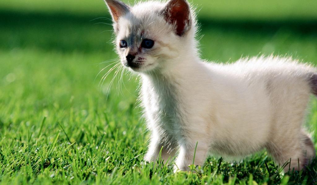 Обои Белый котенок гуляет по газону