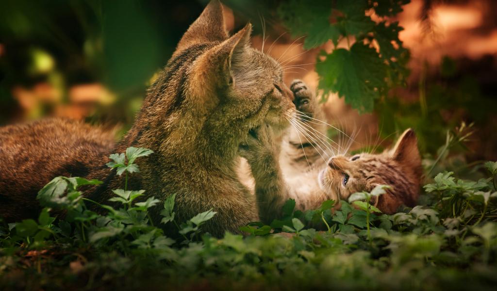 Обои Котенок играет с кошкой