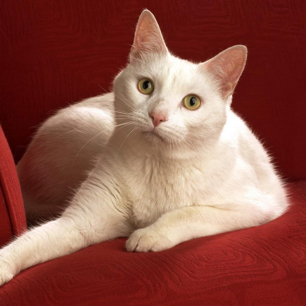 Обои Белый кот на красном диване