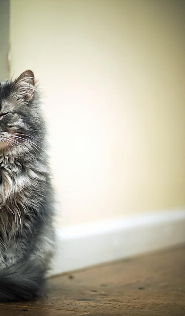 Обои Кот спит сидя у стены