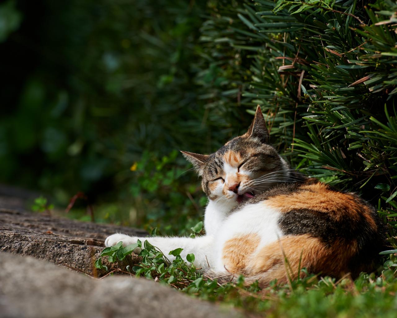Обои Разноцветный кот лижется в кустах
