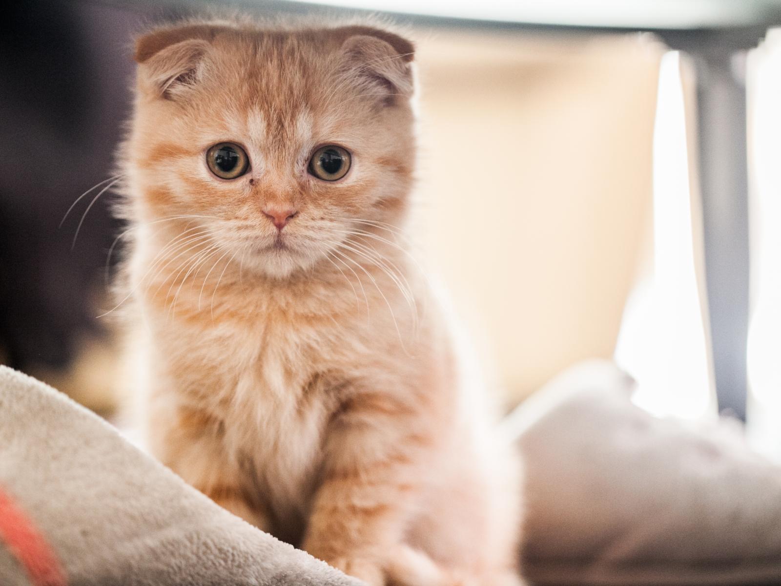 Обои Маленький рыжий шотландский вислоухий кот на кровати
