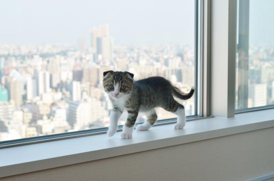 Обои Маленький шотландский вислоухий кот на фоне большого города