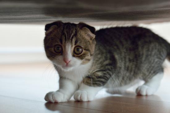 Обои Маленький шотландский вислоухий кот под кроватью