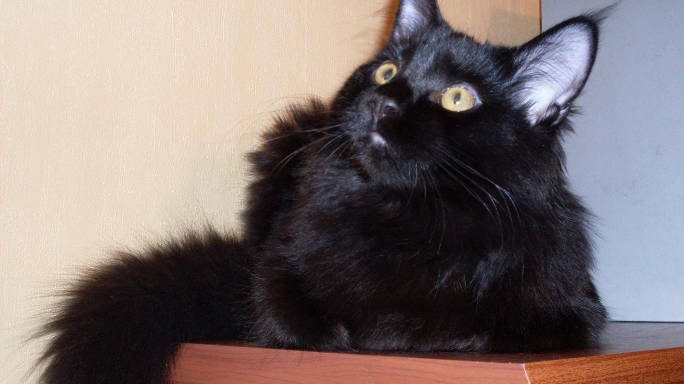 Обои Чёрный кот мейн-кун кого-то увидел