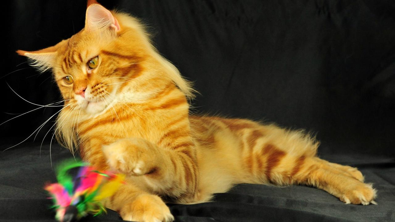 Обои Рыжий молодой кот мейн-кун играет на чёрном фоне