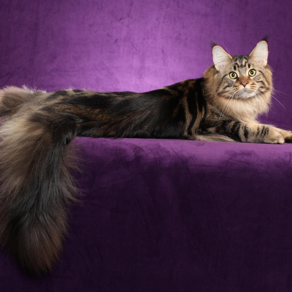 Обои Кот мейн-кун позирует на фиолетовом фоне
