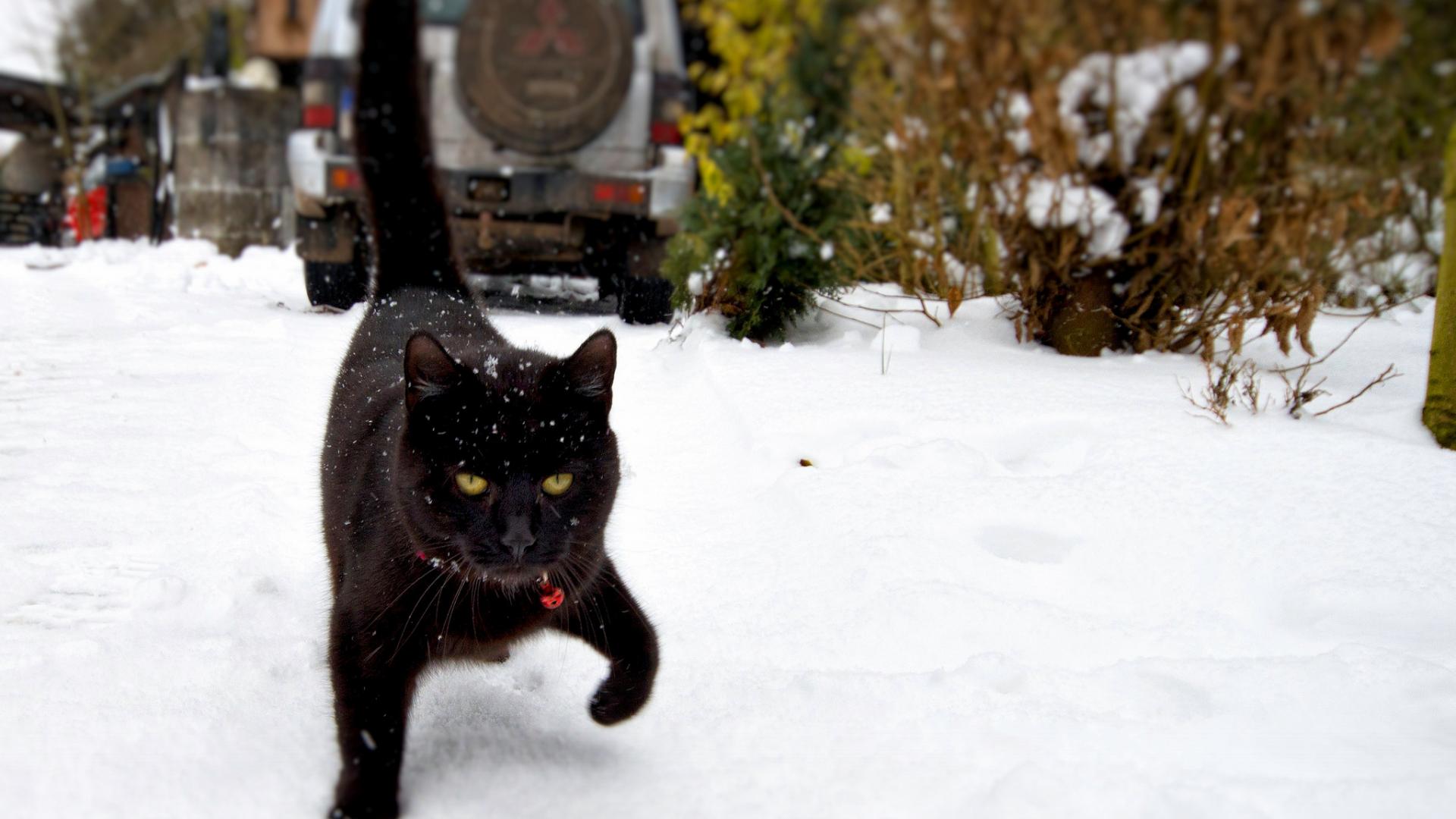 Обои Чёрный кот шагает по снегу