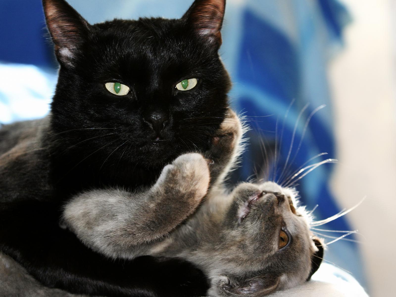 Обои Чёрный и серый кот играют