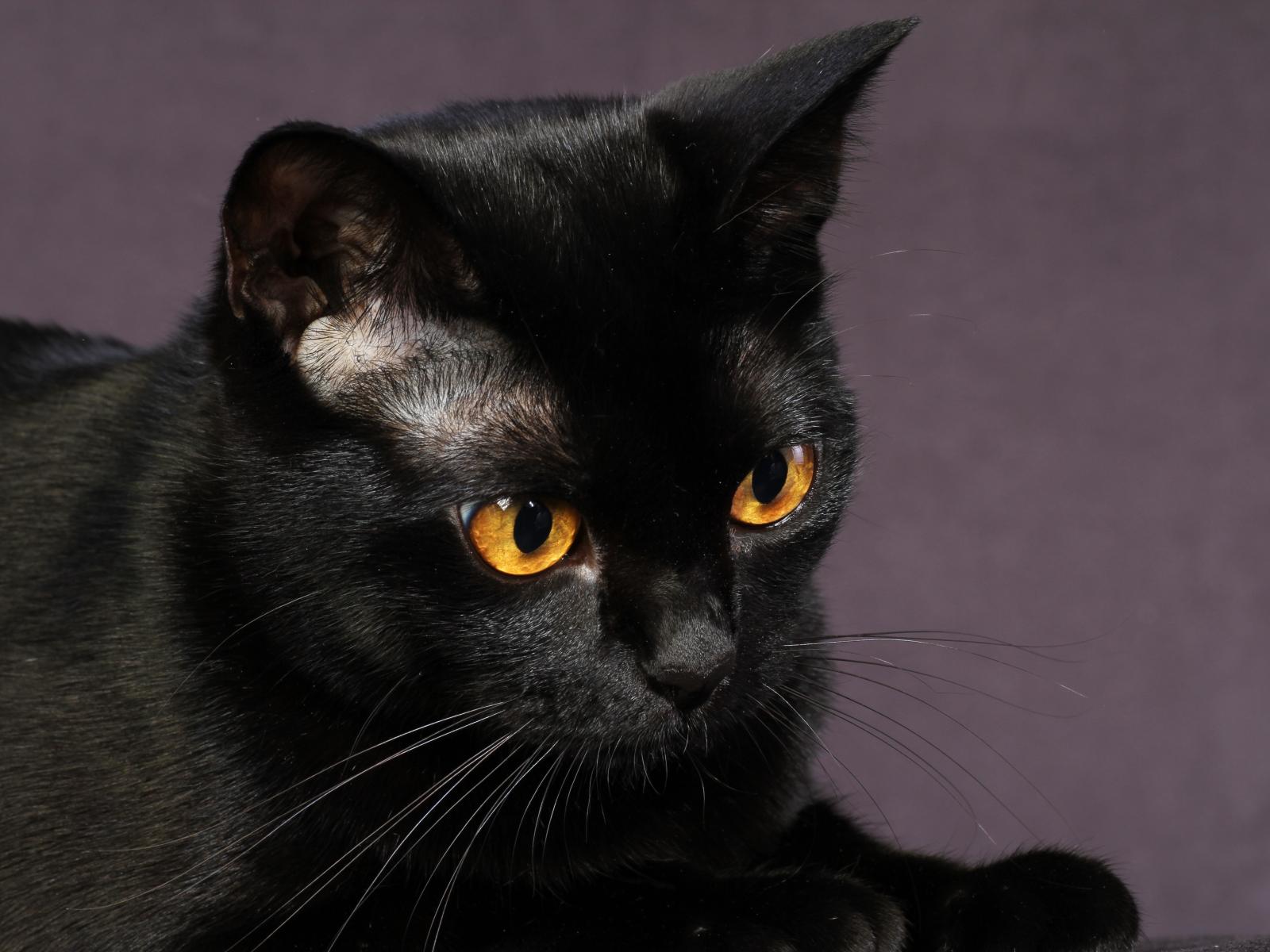 Обои Молодой чёрный кот на фиолетовом фоне