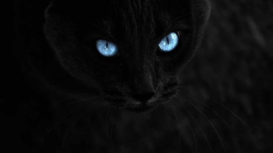 Обои Чёрный кот с голубыми глазами на чёрном фоне